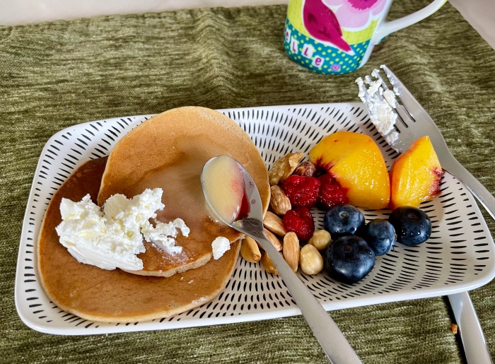 버거씨표 팬케이크에 나는 본마멍 크림치즈를 얹고 꿀을 발랐다. 맛있네!?