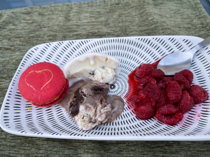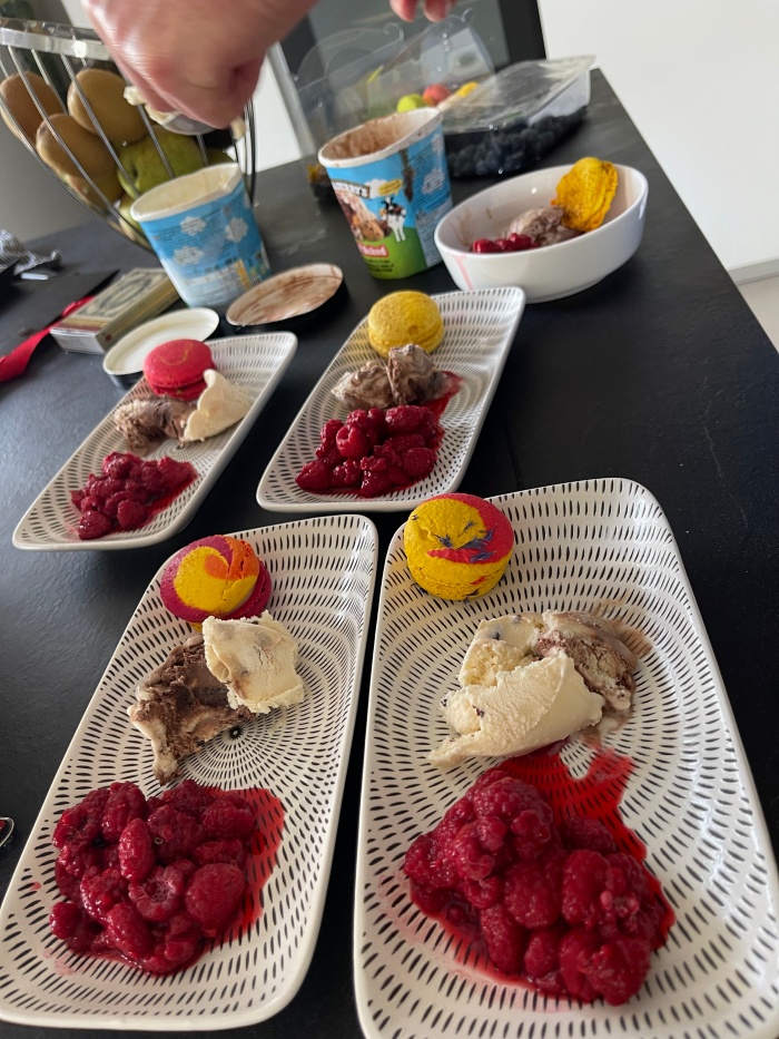 라즈베리 콩포트를 얹고 아이스크림까지 푸는 버거씨.