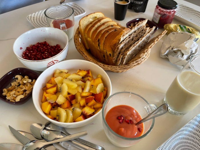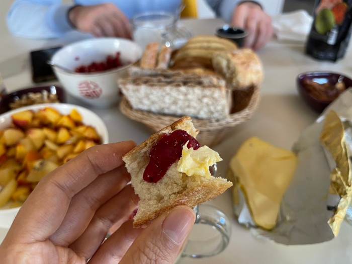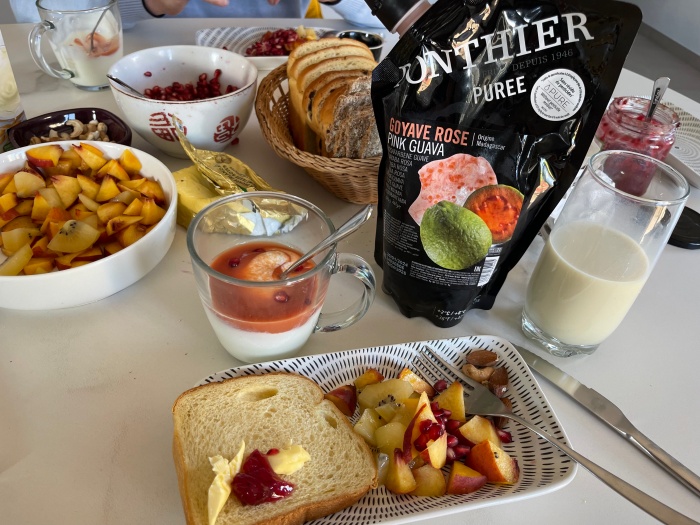 바게트에 버터랑 라즈베리잼도 맛있고 구아바 퓨레랑 석류를 섞은 요거트도 맛있었다.