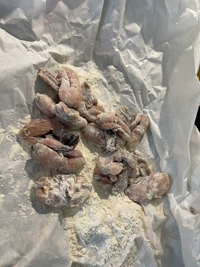 버거씨는 능숙한 솜씨로 개구리에 가루를 입힌 후 (아마도 전분?) 팬에다 볶았다.