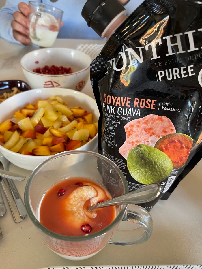 "내가 장보다가 뭘 찾아냈는지 좀 봐! 구아바 퓨레야! 그냥 구아바도 아니고 핑크 구아바!! 이거 요거트에 섞어 먹으면 진짜 맛있겠지?"