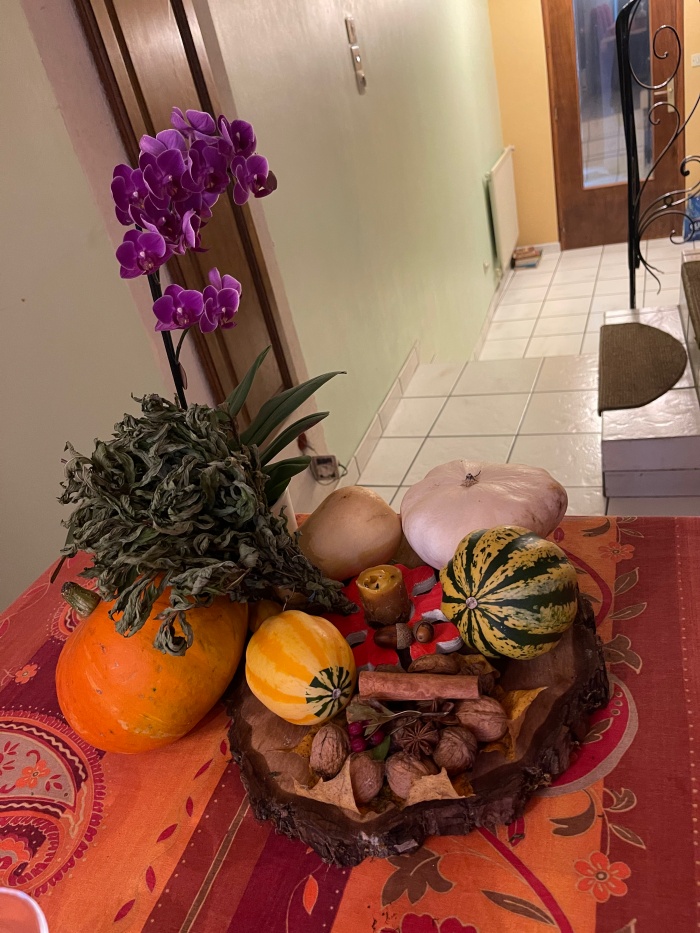 테이블 위에 분홍 오키드 화분과 함께 호박과 호두등이 예쁘게 장식되어 있었다.