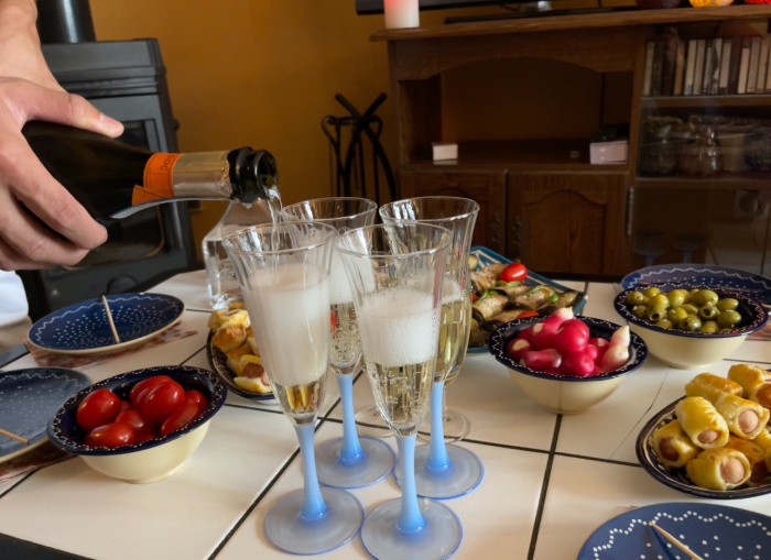 우리는 둘러앉아 샴페인을 마셨다.