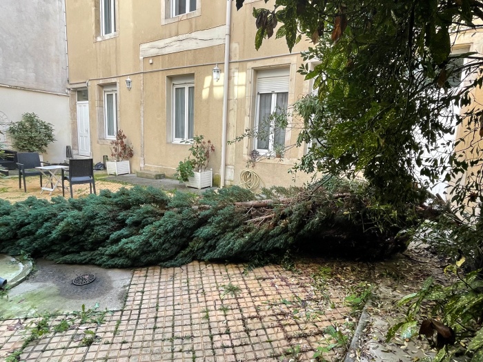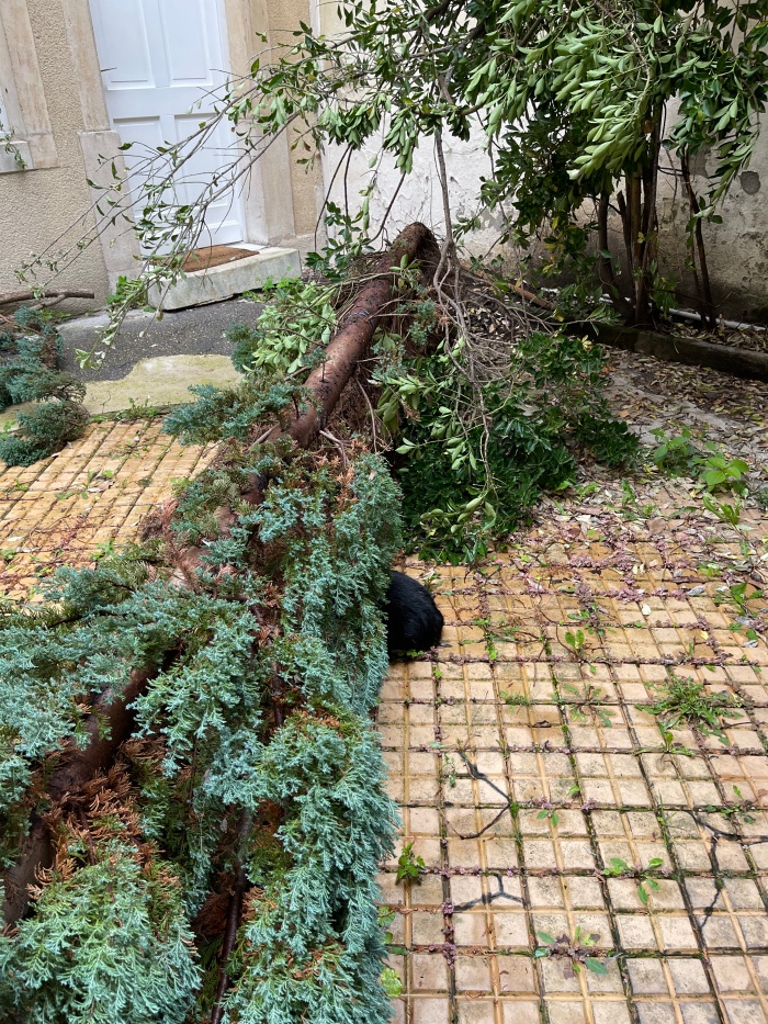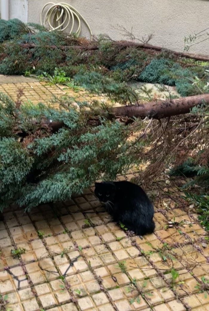 아침에 자고 일어났더니 커다란 나무가 문앞에 쓰러져있었다.