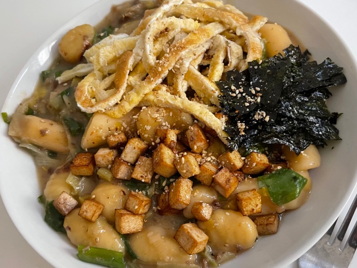 뇨끼를 섞은 궁중떡볶이인데 사실 이틀전에 만들었다가 버거씨 주려고 남겨둔거였다. 간단히 데워서 그 위에다 계란지단에 조미김을 얹었다. 부족한 단백질을 보충하기 위해 두부도 간장기름에 볶아서 얹었다. 떡볶이가 많이 퍼졌는데 고명으로 가려졌다ㅋ