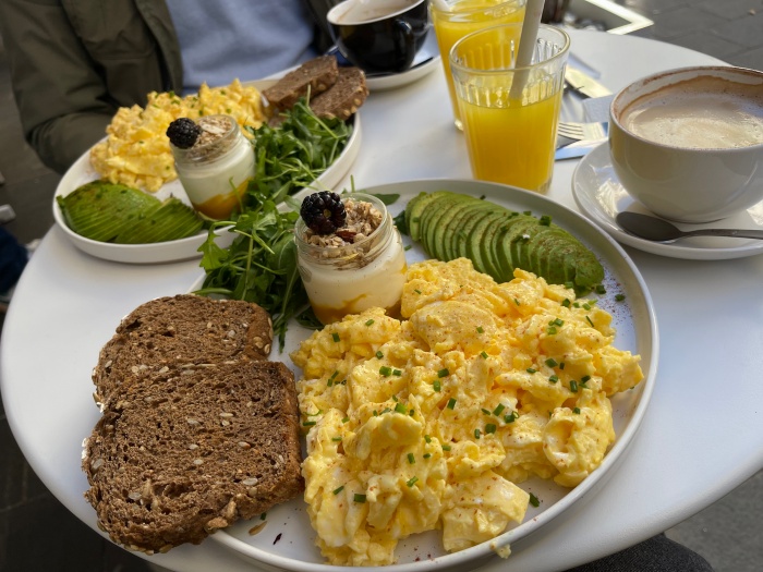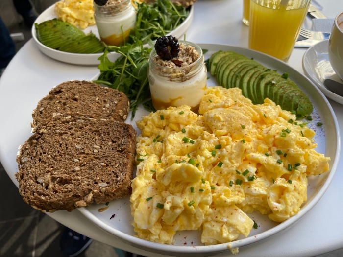 아보카도, 루꼴라 샐러드, 통밀빵, 복분자가 올려진 시리얼 요거트 그리고 어마어마한 양을 자랑하는 스크렘블...