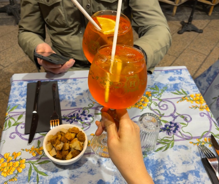 춥기는 했지만 우리는 기분을 내기(?)위해 야외 테라스에 앉기로 했다. 사장님이 정말 괜찮겠냐고 되물을 정도의 날씨였지만 용감한 우리는 한술 더 떠서 얼음장같은 스프리츠까지 주문했다. 나는 버거씨의 태양이니까 우리는 안춥다 안춥다 안춥다... 세뇌 중