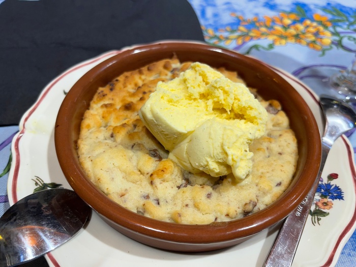 구운 감자도 맛있었고 바게트도 곁들여서 배불리 맛있게 식사를 마쳤다. 후식은 하나를 시켜서 나눠먹었다. 반만 구운(?) 쿠키도우위에 바닐라 아이스크림이 얹어져서 나왔는데 보기보다 양이 많아서 하나만 시키길 잘했다.
