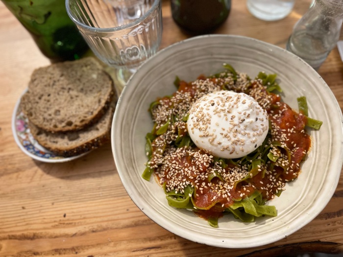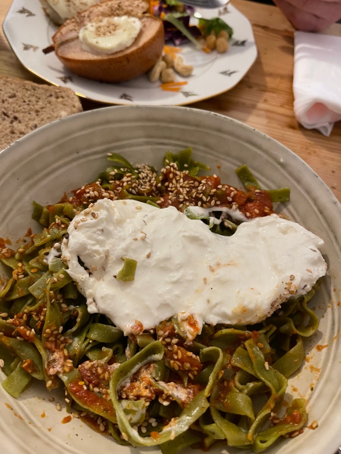 초록색 파스타위에 토마토 소스, 깨 그리고 치즈가 한 덩이 얹어져있다. 첨엔 계란인줄 알고 노른자 터지라고 나이프로 찔렀는데 내 의도를 눈치챈 버거씨가 웃었다ㅋ