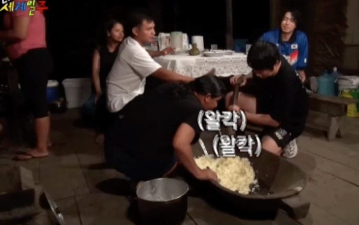 "두 남자 연예인이 외국 가정집에 방문했는데 집에서 전통방식으로 만든 알콜을 얻어 마셨거든. 그게 너무 맛있었던거야. 마침 다음 날 그걸 만든다고해서 구경할 기회를 얻었지. 그집 이모가 와서 도와줬는데 찐 카사바를 으깨다말고 이모가 갑자기 그 카사바를 막 퍼먹는거야..."