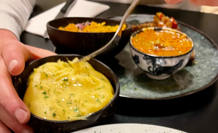 오래오래 익혀서 고기 육질이 엄청 부드러웠다. 그런데 양념은 좀 간이 부족한 느낌이었다. 소금을 달라고 할까 망설이다가 그냥 말았다. 같이 나온 소스들이 맛있어서 함께 먹으니 조합이 괜찮더라. 소고기와 함께 나온 샐러드는 바나나를 고구마 같은거랑 같이 아주 찰지게(?) 으깬 맛이었다.