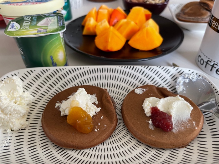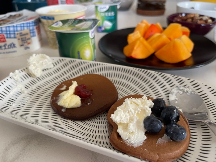 팬케이크위에 마담로잌 크림치즈를 바르고 서로 다른 잼을 얹어보았다. 그 다음에는 블루베리랑 생크림버터도 얹어보고-