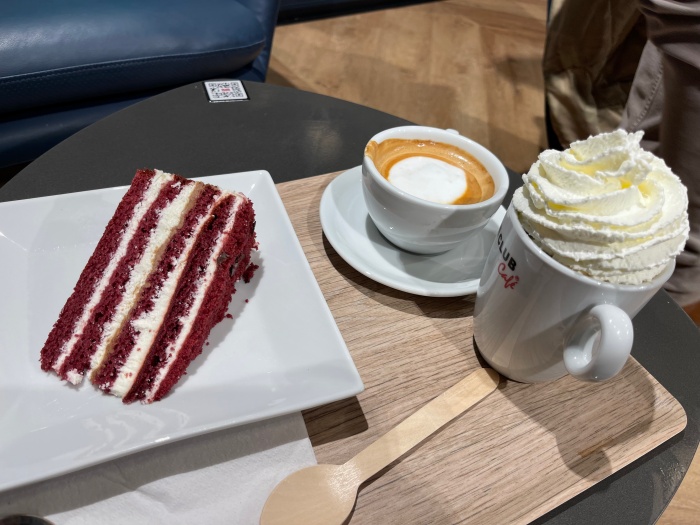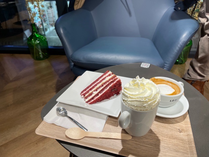 곧 식사를 할 예정이긴 했지만 나는 퇴근 직후라 배가 살짝 고팠다. 생크림이 듬뿍 올라간 디카페인 라떼를 주문했고 거기다 레드벨벳 케이크 한 조각도 추가했다. 한참 당이 땡기는 오후-
