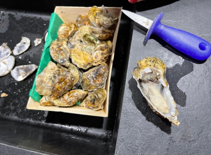 "이 정도면 26일까지 먹을건 충분하겠지? 일단 오늘 저녁에는 샴페인이랑 굴, 훈제연어 그리고 바다 거미(araignées de mer)를 먹자."