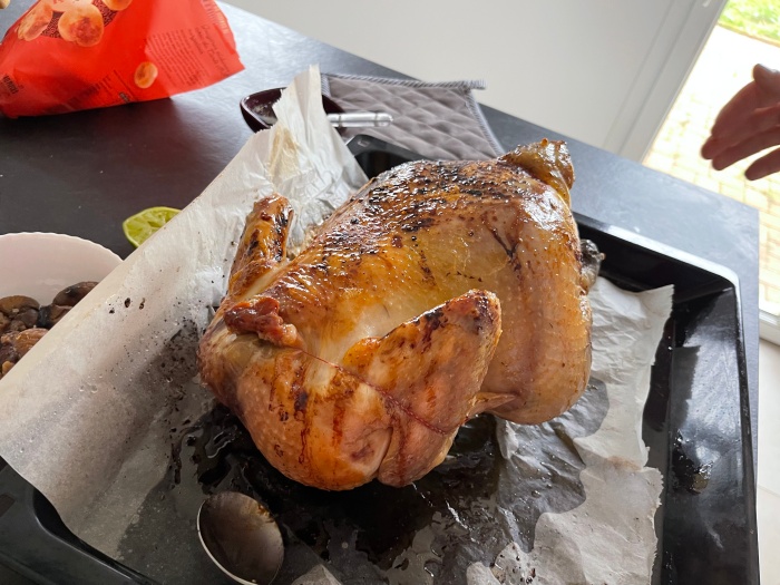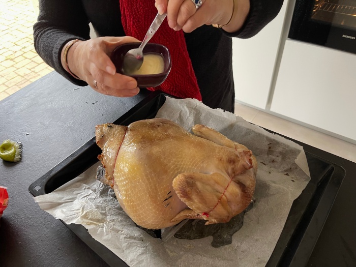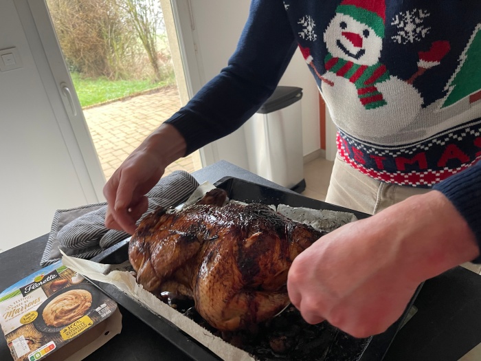 버거씨는 아침부터 열심히 준비하던 샤퐁(커다란 거세수탉)을 어머니께 보여드리며 검사(?)를 받았다.