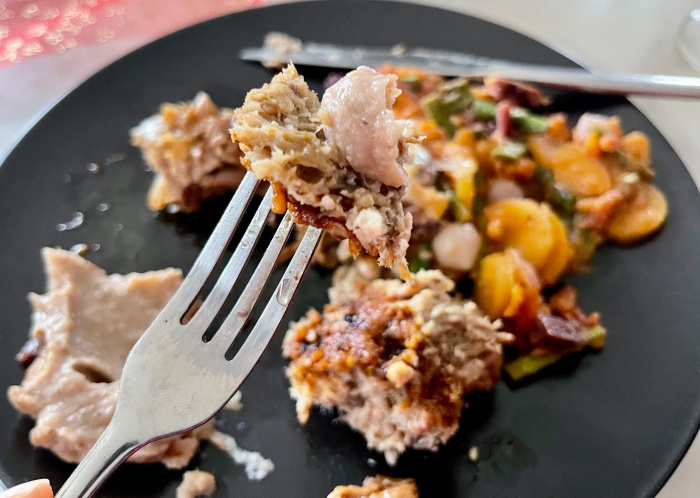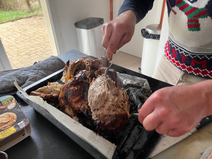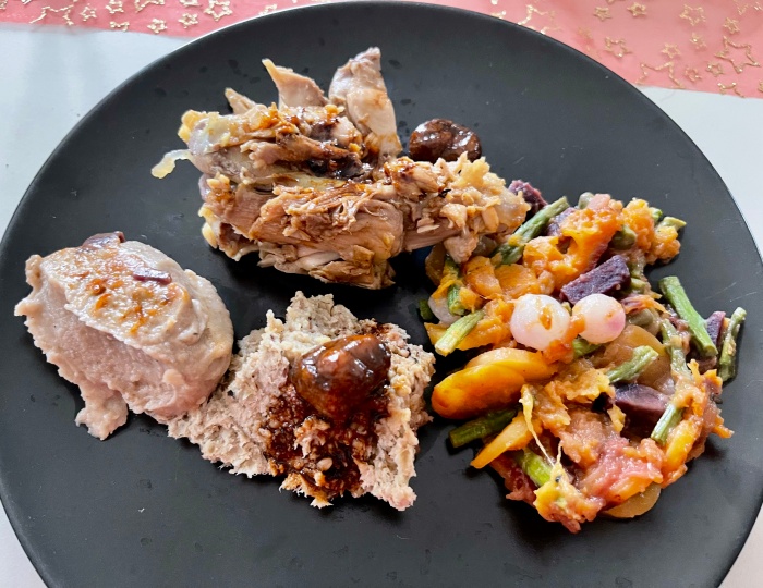 샤퐁과 (나는 허벅지살을 골랐다) 뱃속에 있던 송아지고기, 오븐에서 같이 구워진 밤, 야채 구이 그리고 밤 퓨레.