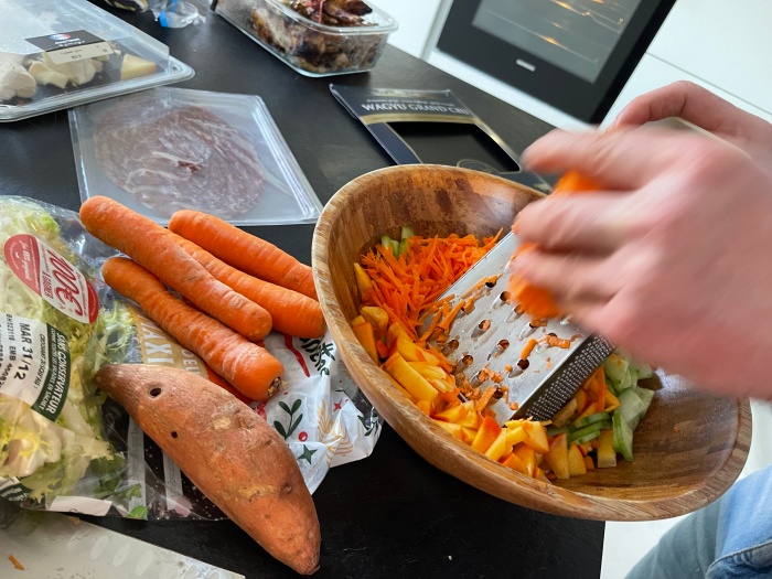 아보카도, 단감, 오이, 피클을 잘라 넣은 후 버거씨가 당근을 채칼에 썰고 있을때 내가 말했다.