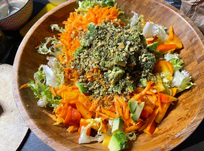 버거씨는 여기에 레몬즙과 함께 별별 바삭하고 감칠맛 넘치는 다양한 유기농 곡물 가루들을 첨가했다. 그리고 역시 마지막은 오늘도 잡채소스로 마무으리. 맛이 없을수가 없지. 어머니 버거씨 샐러드의 비밀은 잡채소스랍니다.
