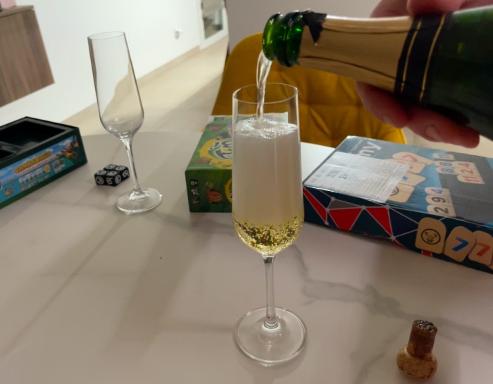 우리 네사람은 보드게임을 하면서 샴페인을 마셨다.