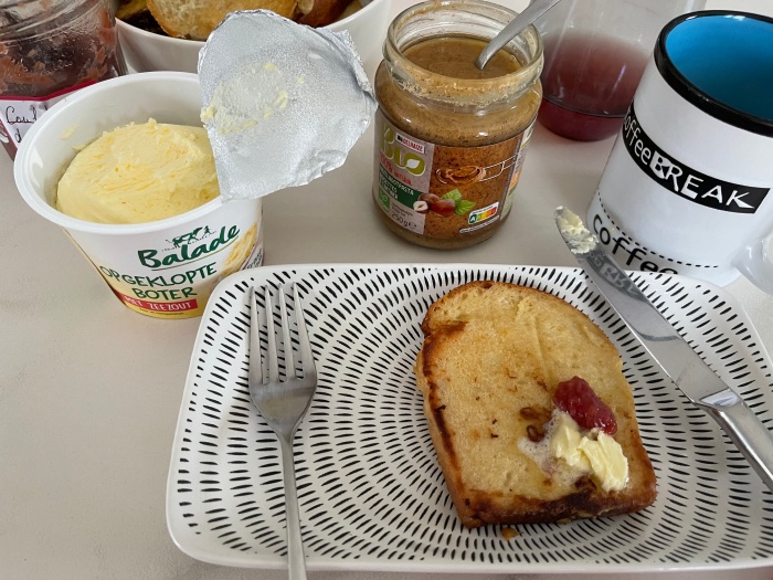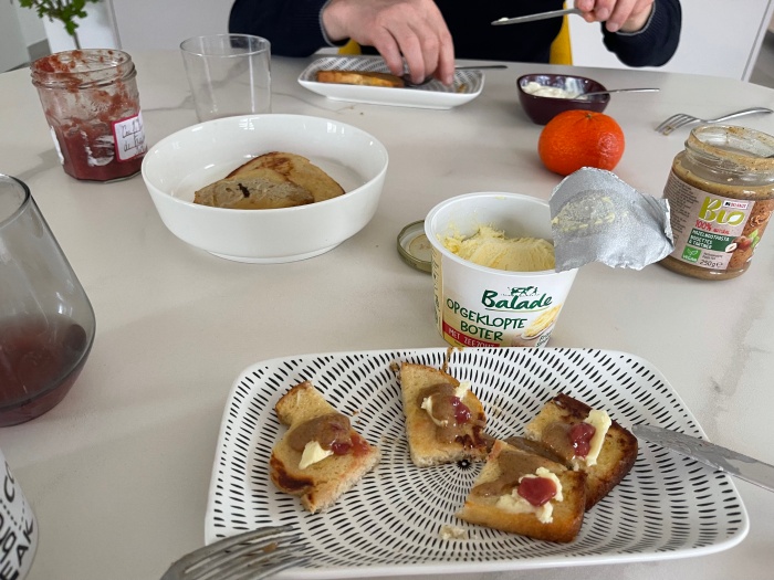가염버터에 어머니표 수제 라즈베리잼 그리고 헤이즐넛크림을 얹어 먹었다. 버거씨도 너무 맛있다고 막 먹다가 아들들몫은 딱 두조각만 남았네. 간단하게 조금만 먹으려던 계획이 틀어져버렸다.