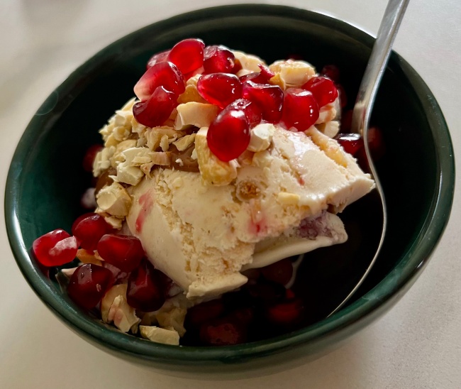 아들들은 각자 본인들이 펐고 내꺼는 버거씨가 예쁘게 퍼다줬다. 헤이즐넛 버터 한 숟가락, 견과류 한 줌 그리고 석류도 한 줌 얹어서 말이다.