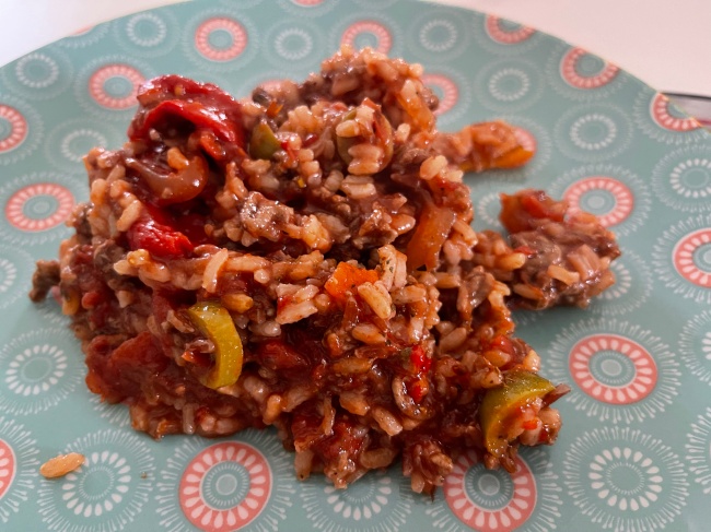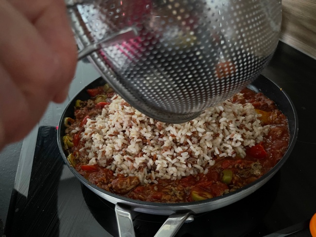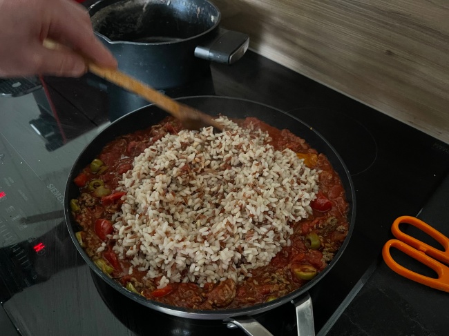 간소고기에 토마토 소스 그리고 올리브 등을 넣고 보글보글 끓이더니 파스타 대신에 삶은 밥을 넣는 버거씨.
