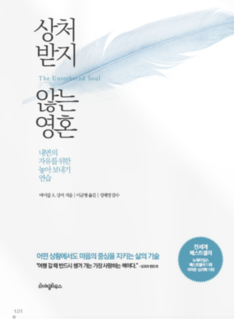 그의 또다른 책 [삶이 당신보다 더 잘 안다]라는 제목처럼 마이클 싱어는 우리가 삶에서 아둥바둥 할 필요가 없다고 강조한다. 우리 머리로 뭔가 미래를 계획하지 않아도 삶은 알아서 우리가 생각해 본 적없는 최상의 미래로 우리를 인도할 거라고 말해준다. 얼마나 큰 위로가 되는지. 하지만 내가 바이블처럼 일상에서 반복해서 읽고있는 최애 책은 [상처받지 않는 영혼]이다.