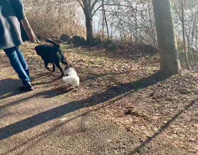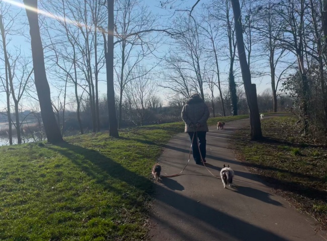 앞서가는 강아지들은 빨리 걷다가도 뒤에 식구들이 제대로 잘 따라오는지 확인하기위해 자꾸만 멈춰서서 뒤돌아보았다. 그 모습이 어찌나 웃긴지 나와 버거씨는 천천히 따라걸으면서 웃었다.
