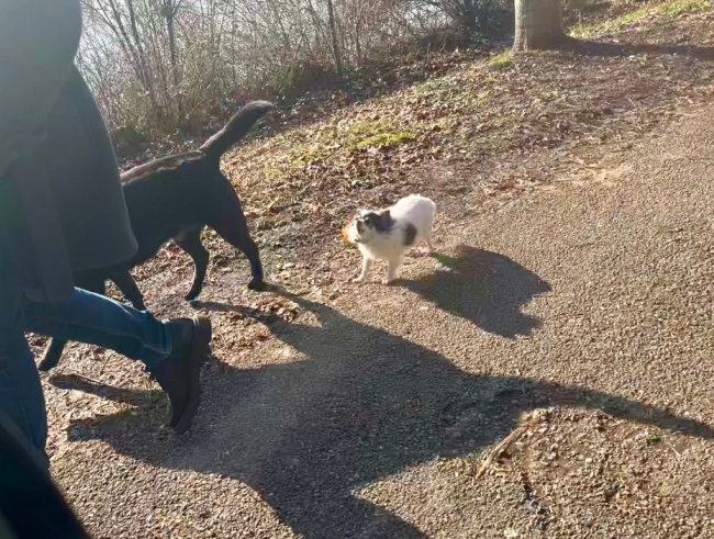 할머니께서 "뻬뻿!" 하고 애칭을 부르니 과연 철조망속 숲에서 야옹~ 하는 대답이 들려왔다. 나랑 버거씨는 너무 귀여워서 소리내 웃었다. 철조망 속을 살펴보니 목에 리본을 단 고양이가 할머니와 강아지들을 놓치지 않기위해 열심히 뛰어오고 있는 모습이 보였다. 아 귀여워ㅋㅋ