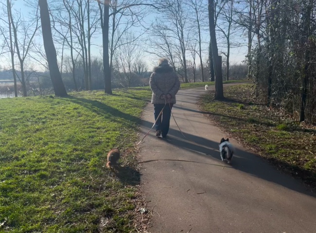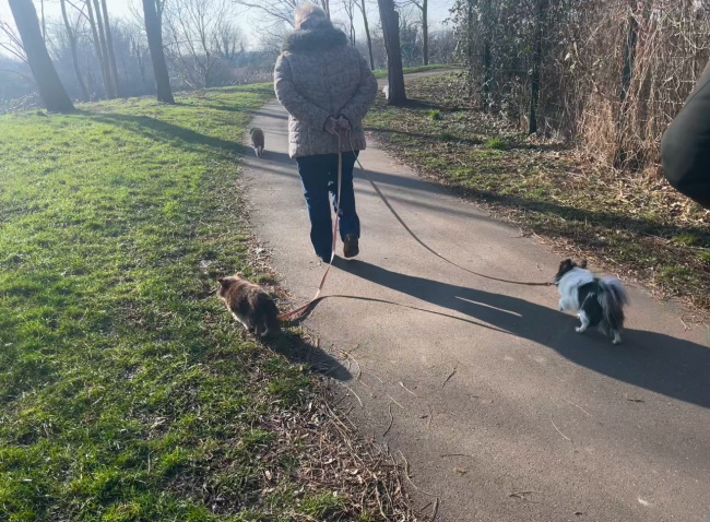 우리 앞에 어느 할머니께서 강아지 두마리를 산책시키고 있었는데 버거씨가 웃으며 가리키는 곳에 보니 저 앞에 강아지 두마리가 목줄없이 앞장서서 걸어가고 있네? 마치 할머니와 동생 강아지들을 보호하겠다는 듯 앞서가는 두 마리의 걸음이 당당했다.