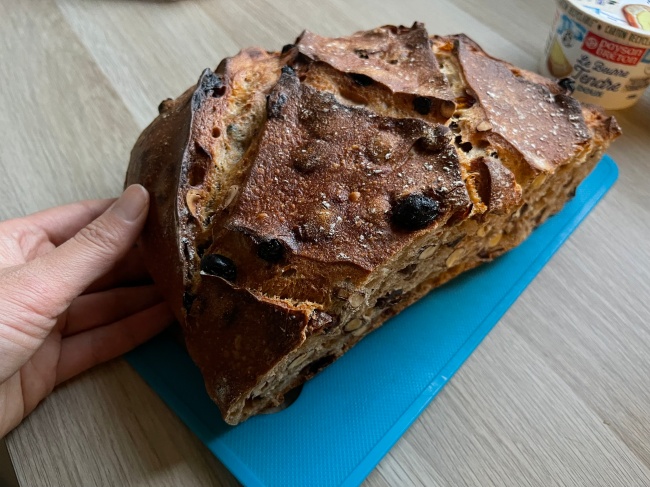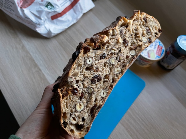 헤즐넛이랑 건포도가 박힌 곡물빵이다.