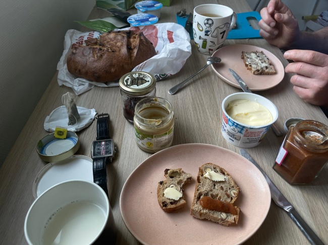 피스타치오 크림, 버터 그리고 버거씨 어머니께서 만들어주신 딸기잼을 곁들였다. 빵 자체가 맛있으니 대충 곁들여도 맛있긴 하다.