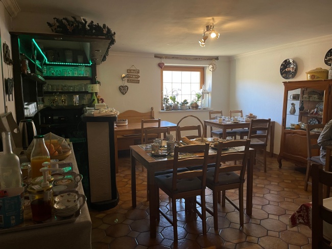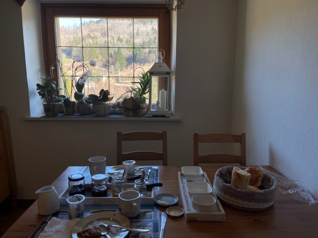 우리가 앉자마자 사장님은 다양한 종류의 신선한 빵이 담긴 바구니와 버터, 3가지 종류의 잼 (미라벨, 딸기, 블루베리)을 주셨고 우리를 위한 커피를 만들러 떠나셨다. 나는 오늘도 디카올레, 즉 디카페인 라떼였다.