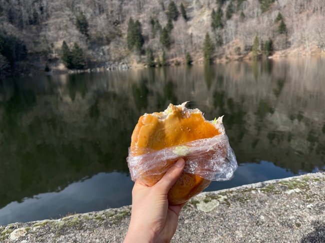호수에 도착하면 예쁜 호수를 보면서 먹을거야.