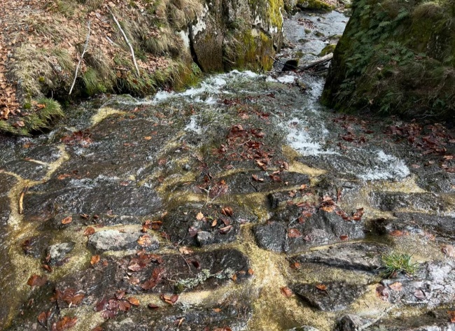 호수를 지나 숲으로 다시 진입할 때 우리는 미끄러운 개울을 건너야 했다.