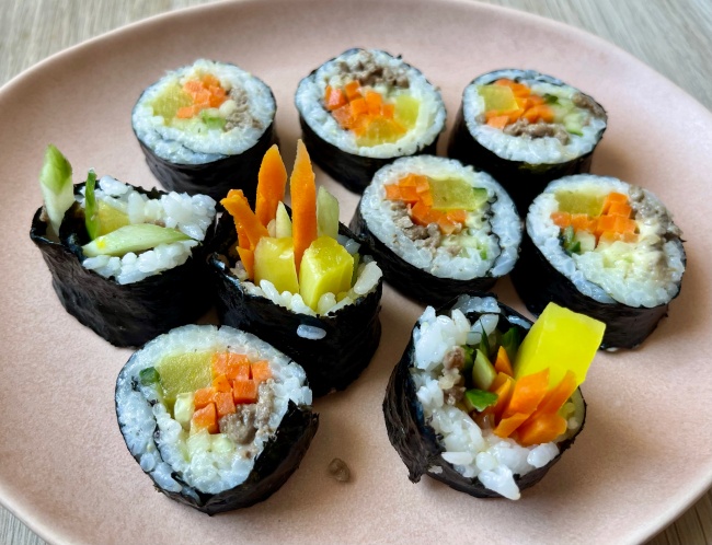 그냥 있는 재료로 대충 쌌다. 간소고기, 오이, 당근, 단무지-