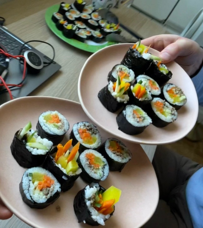 "하하 4인분? 한국에서 김밥 한줄은 그냥 사이드야. 보통 라면 한 그릇을 먹으면서 김밥 한줄은 반찬처럼 같이 먹는게 한국에서는 일반이라고. 김밥을 메인으로 먹는다면 두 줄도 부족한 느낌이지."