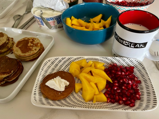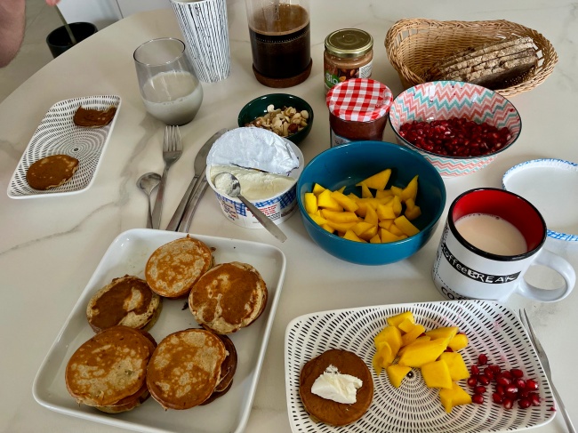 통밀빵 혹은 팬케이크에 버거씨 어머니표 수제 라즈베리 잼과 본마멍 크림치즈 혹은 헤이즐넛 크림을 발라먹었다.
