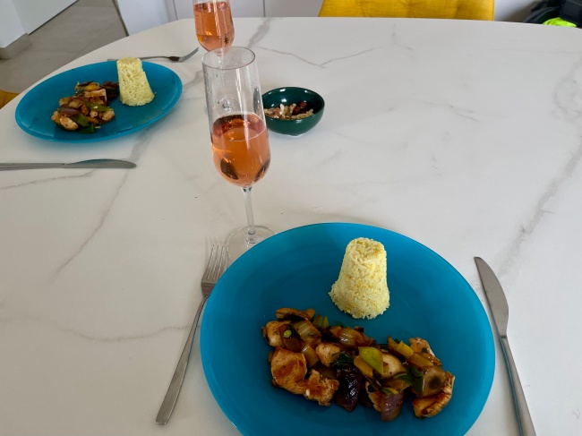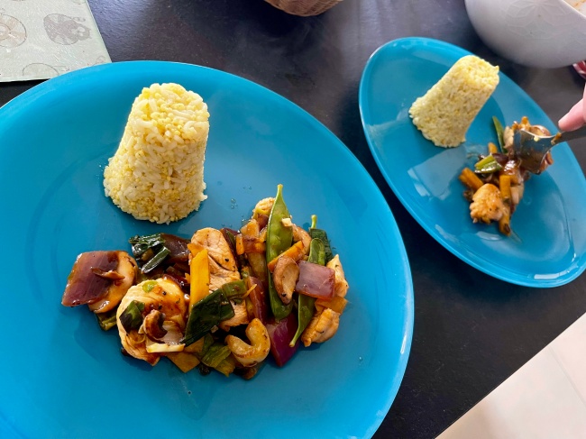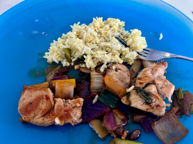 전날 양념에 재워뒀던 칠면조 가슴살을 각종 야채에 휘리릭 볶아서 밥과 함께 냈다.