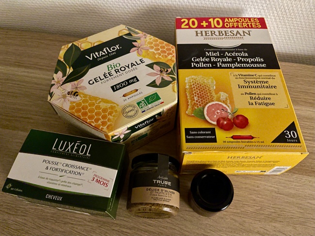 유기농 로얄제리 한상자랑, 로얄제리에 꿀, 프로폴리스, 아세로라, 자몽이 추가된 앰플도 한상자 더 샀다고 한다. 거기에 트러플이랑 무슨 영양제까지.