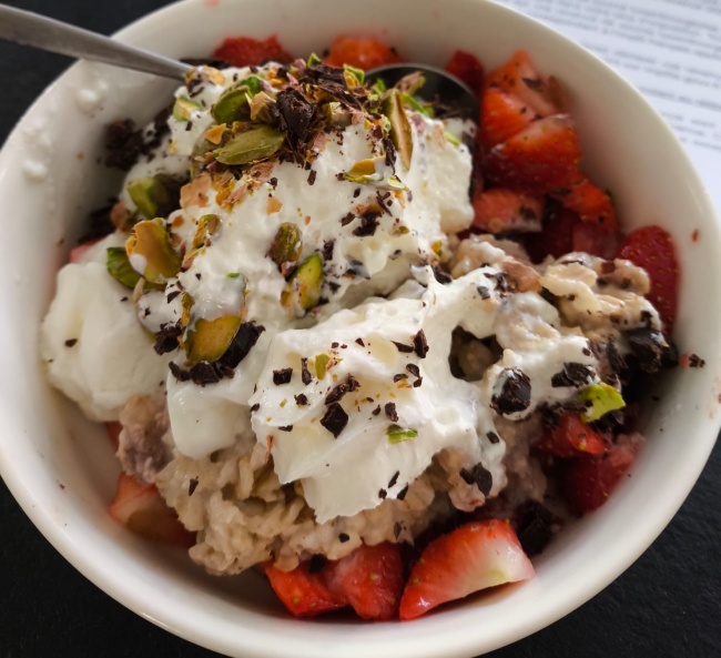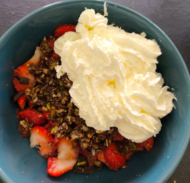 이틀간 고민하던 버거씨는 결국 엉트레로 비비고 만두를 구워서 낼거라고 했고 (마트에서 1+1이었다며 여러봉지를 사왔단다ㅋ) 디저트로는 딸기+ 라즈베리에 아이스크림, 휘핑크림, 견과류등을 얹어서 낼거란다. 며칠동안 디저트 만드는 연습을 한다며 사진을 계속 보내왔다.