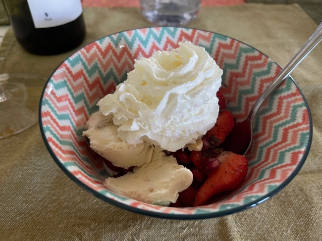 이틀간 고민하던 버거씨는 결국 엉트레로 비비고 만두를 구워서 낼거라고 했고 (마트에서 1+1이었다며 여러봉지를 사왔단다ㅋ) 디저트로는 딸기+ 라즈베리에 아이스크림, 휘핑크림, 견과류등을 얹어서 낼거란다. 며칠동안 디저트 만드는 연습을 한다며 사진을 계속 보내왔다.