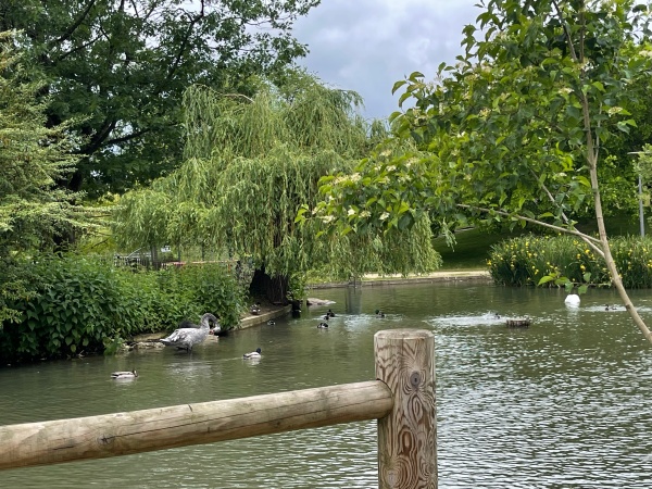 오리와 백조들이 평화롭게 노니는 연못앞에 있는 테이블위에다 우리는 가방을 풀었다.