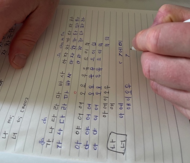 상처에 파라핀 거즈랑 붕대를 새로 감은 후 우리는 한글 공부를 시작했다.