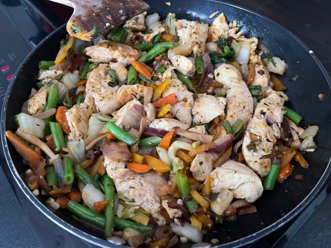 버거씨가 (밥이나 면도 없이!)담아주는 닭고기 야채 볶음위에 나는 아침에 먹다남은 바나나 땅콩 팬케이크를 두장씩 얹었다. 이로서 탄수화물이 적절하게 녹아들었네ㅋ 맛있다!