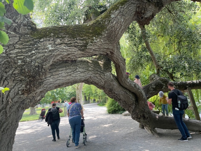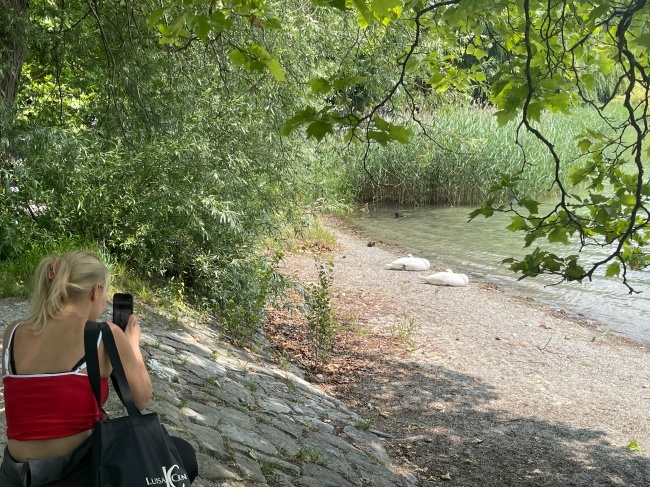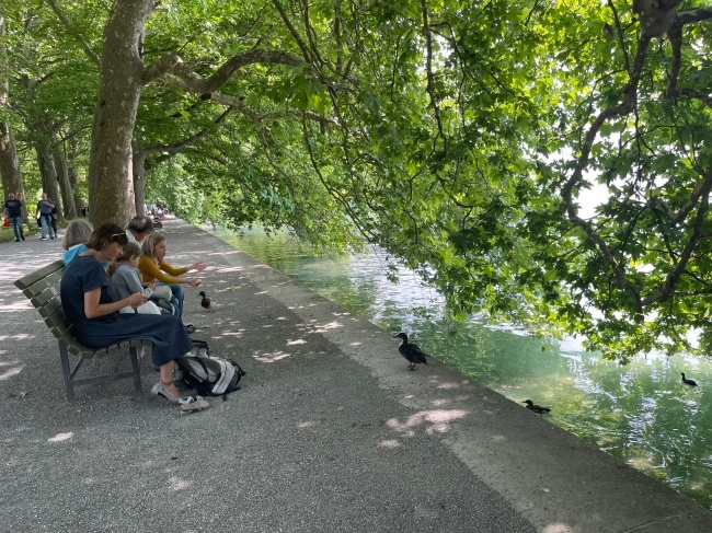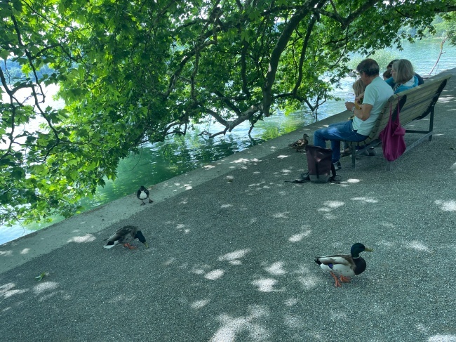 사람들이 앉아있는 벤치마다 구걸하는 오리들이 몰려들었다.