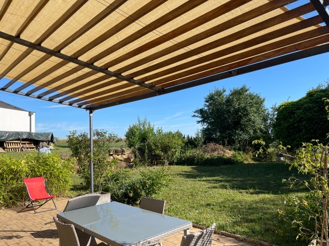 이른 아침에는 테라스 차양막 아래로 해가 비스듬히 들어와서 테이블을 시원한 나무 그늘 아래로 옮겨앉았다.