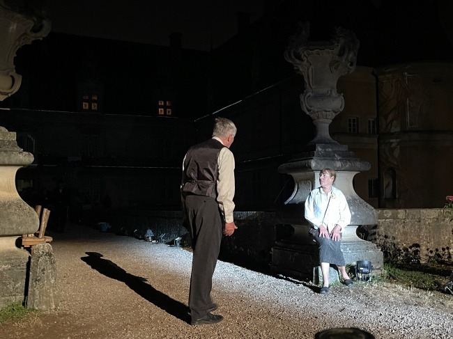 왼쪽 정장 아저씨는 이 극을 이끌어가는 이야기꾼인데 사실 이 샤또의 석상이다.