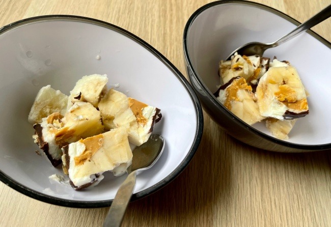 잘익은 바나나를 잘라서 맨 밑에 깔고 크런치땅콩버서 한숟가락, 그릭요거트를 층층이 넣고 맨 위에는 다크초코를 (전자렌지에 녹이면 더 나은데) 잘게 잘라서 얹고 견과류로 데코를 했다. 큐브가 너무 커서 미리 꺼내놨다가 좀 녹았을때 칼로 잘랐다. (작은 사이즈 틀을 살 예정이다;)