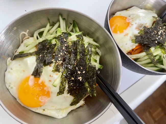 다진소고기를 간장에 미리 볶아둔게 있어서 같이 넣었고 볶은 당근도 밑에 깔려있는데 오이채를 너무 많이 덮었더니 밑에 깔린게 아무것도 안보이네. 이것도 버거씨가 너무너무 좋아했다. 무엇보다도 엄청 빨리 만들었는데도 너무 예쁘고 정성가득해 보인다면서 놀래더라.